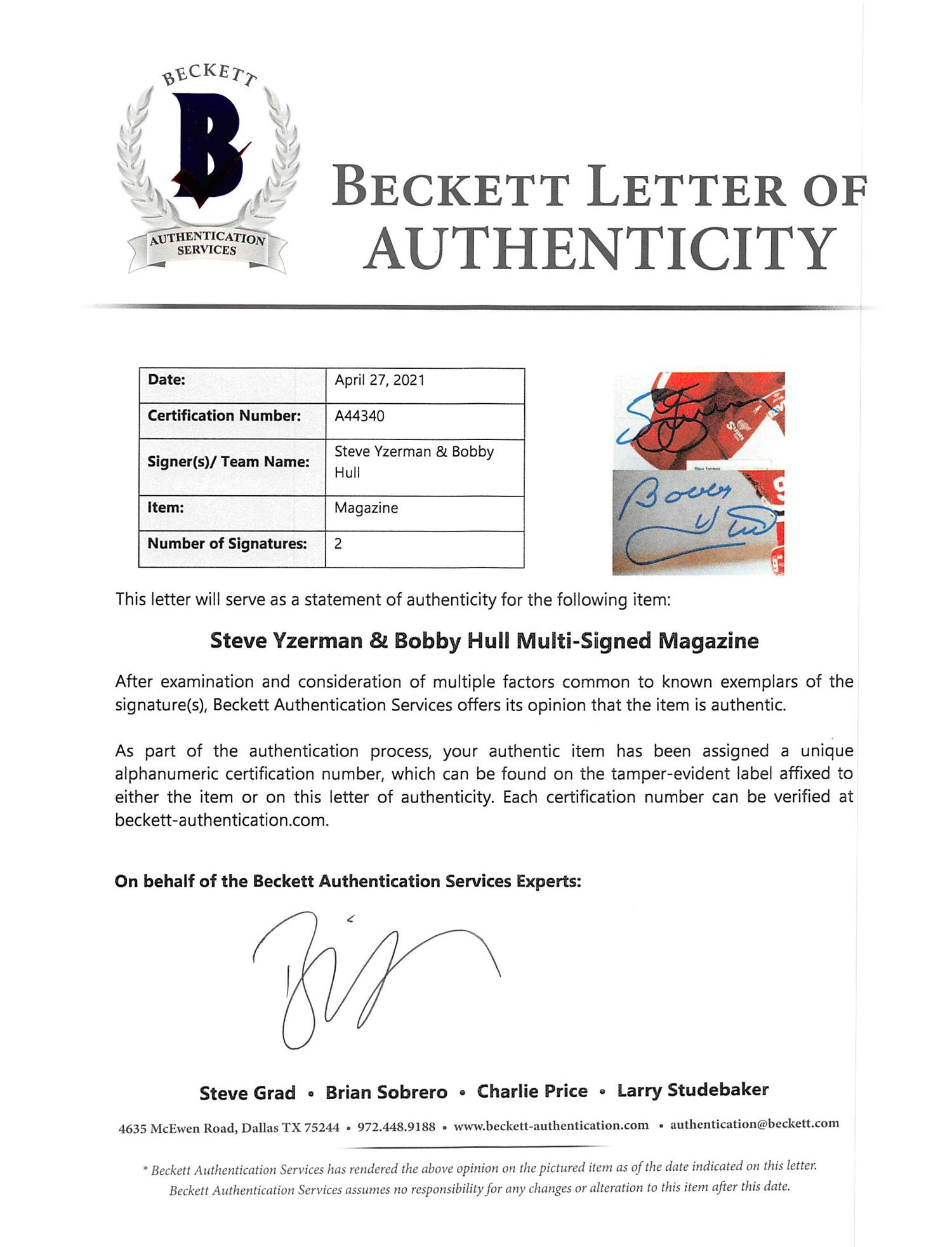 Steve Yzerman & Bobby Hull Authentic Signed Beckett Monthly Magazine BAS #A44340 is backordered and will ship as soon as it is back in stock.