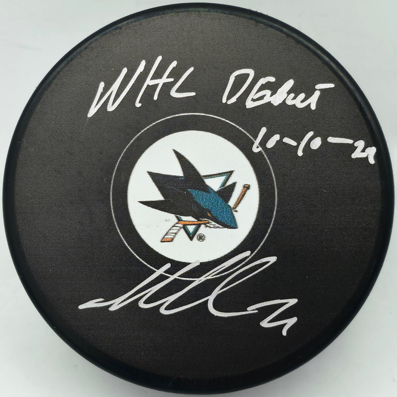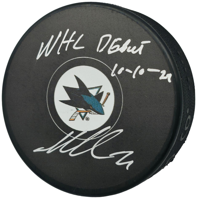 Macklin Celebrini Autographed Official San Jose Sharks Logo Hockey Puck "NHL Debut 10-10-24" Fanatics Holo Stock #256807