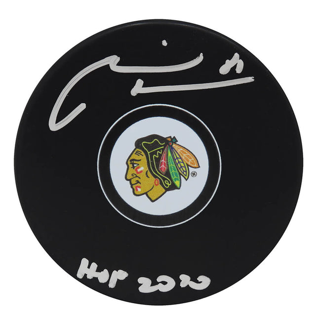 - Item: Chicago Blackhawks logo hockey puck, hand-signed with "HOF 2020" inscription