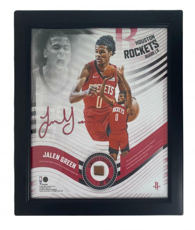 Celebrate your passion for the Houston Rockets with this exclusive Jalen Green Framed 15" x 17" Game-Used Basketball Collage. Limited to just 1 of 50, this rare collectible is perfect for serious fans and memorabilia enthusiasts looking to own a piece of basketball history.