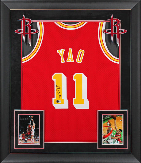 Rockets Yao Ming Signed Red M&N 2004-05 HWC Swingman Framed Jersey BAS Witnessed