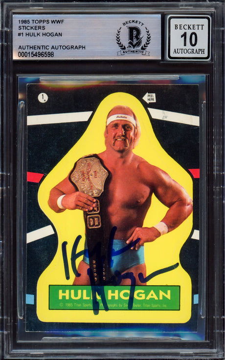 Very low stock (1 unit)$1,279Unit price /UnavailableHulk Hogan Authentic Signed 1985 Topps WWF Stickers #22 Card Auto 10 BAS Slabbed