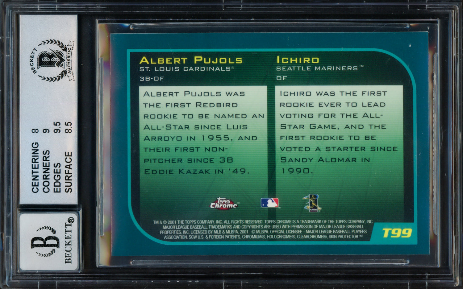 Albert Pujols & Ichiro Suzuki Autographed 2001 Topps Chrome Traded Rookie Card #T99 BGS 8.5 Auto Grade Gem Mint 10 "01 ROY" Beckett BAS #15681151