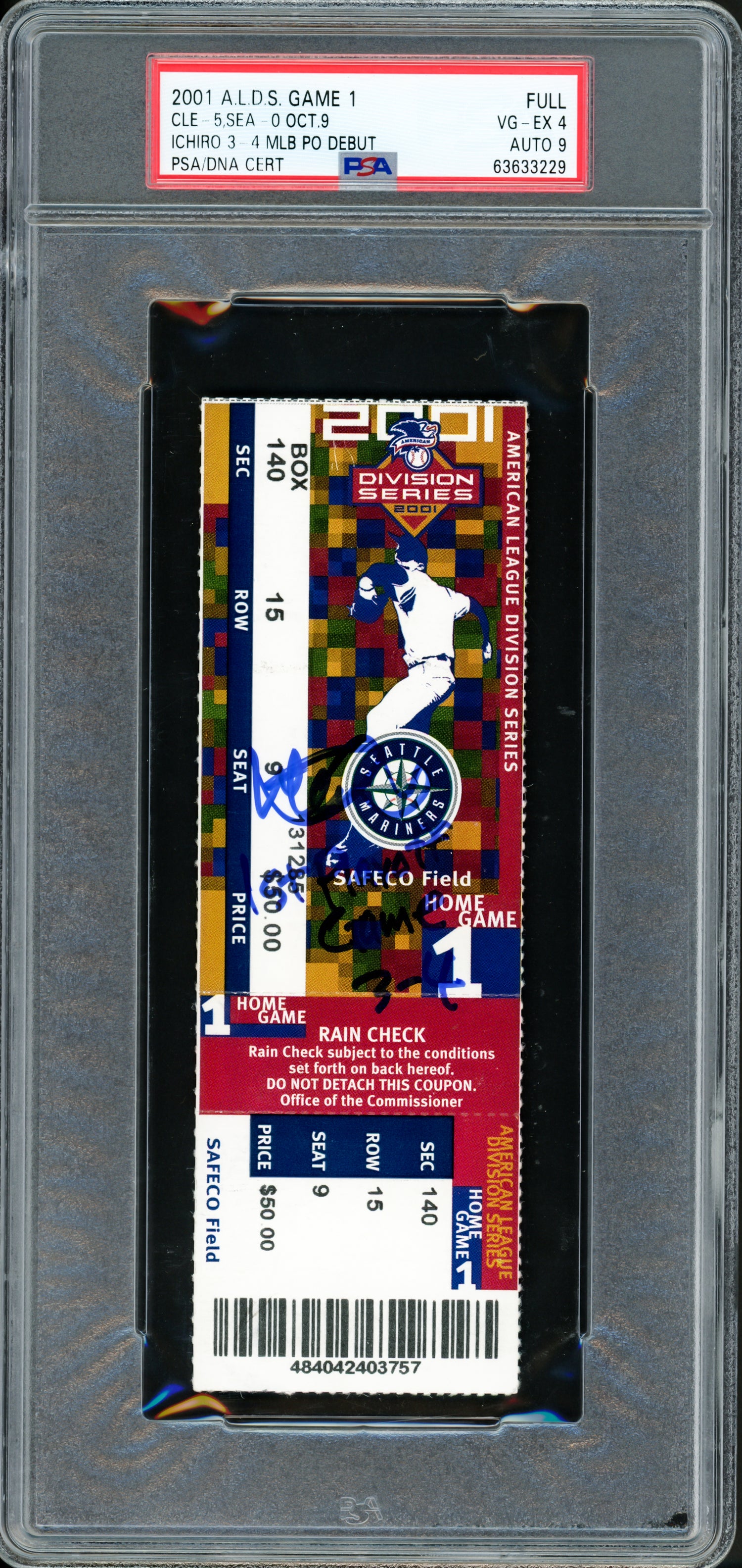 Ichiro Suzuki Autographed 2001 ALDS Game 1 Ticket Seattle Mariners PSA 4 Auto Grade Mint 9 "1st Playoff Game 3-4" PSA/DNA #63633229