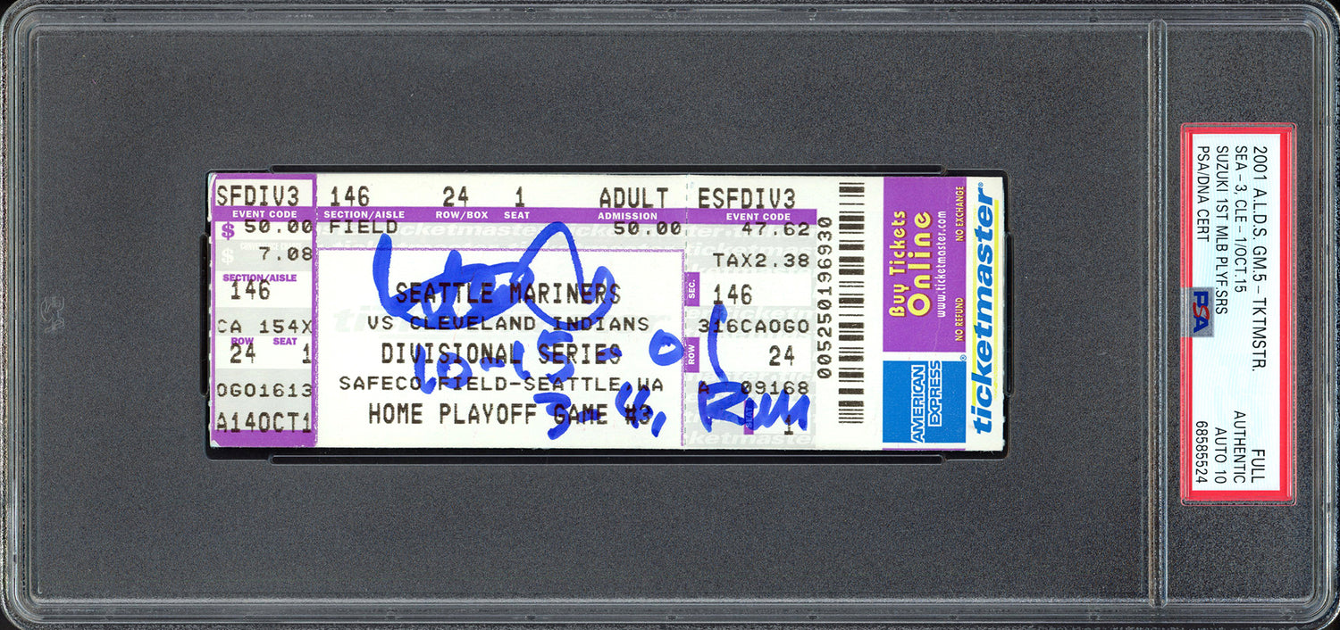 Ichiro Suzuki Autographed 2001 ALDS Game 5 Ticket Stub Seattle Mariners Auto Grade Gem Mint 10 "10-15-01 3-4, Run" PSA/DNA #68585524