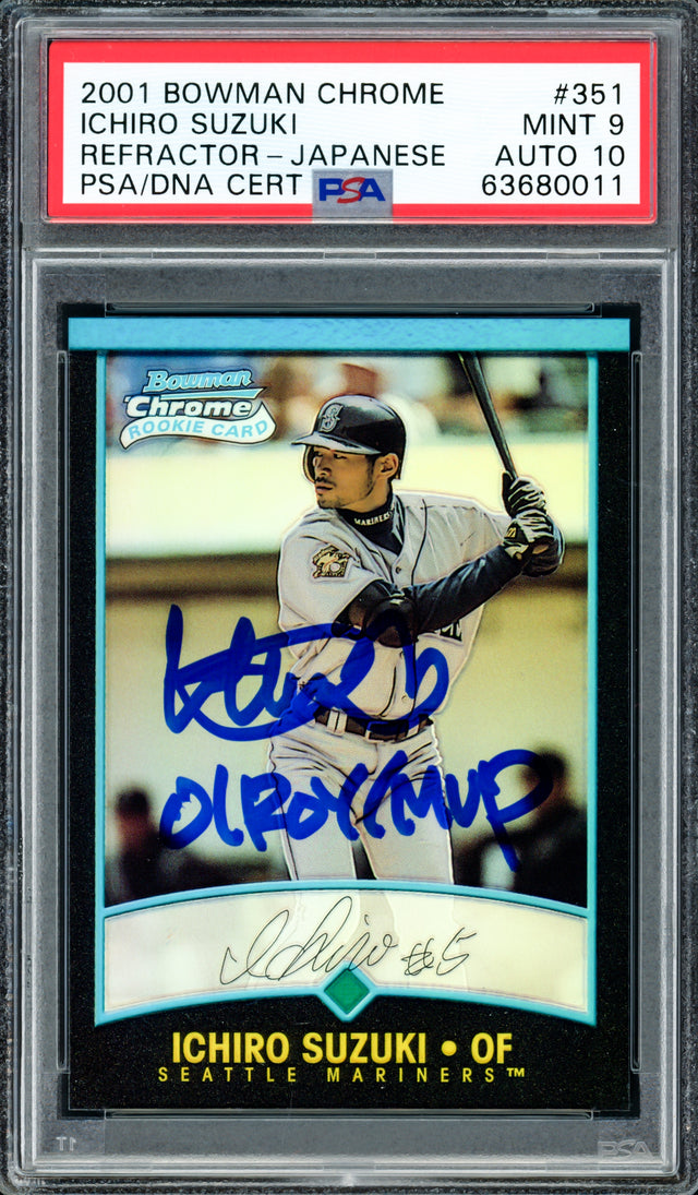 Ichiro Suzuki Autographed 2001 Bowman Chrome Refractor Japanese Rookie Card #351 Seattle Mariners PSA 9 Auto Grade Gem Mint 10 "01 ROY/MVP" PSA/DNA #63680011
