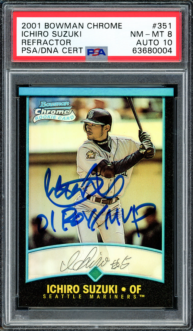 Ichiro Suzuki Autographed 2001 Bowman Chrome Refractor Rookie Card #351 Seattle Mariners PSA 8 Auto Grade Gem Mint 10 "01 ROY MVP" PSA/DNA #63680004
