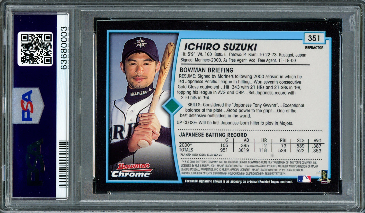 This 2001 Bowman Chrome Refractor Rookie Card #351 is a must-have for serious collectors and Ichiro Suzuki fans. Hand-signed by Ichiro Suzuki, this rare piece of baseball history is further elevated by its exceptional grading and authenticated status.