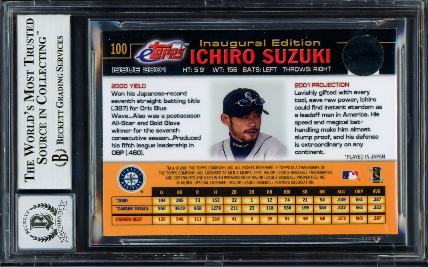 Own a piece of baseball history with this 2001 eTopps Rookie Card #100, hand-signed by Ichiro Suzuki, one of the most iconic hitters in MLB history. This rare collectible has been professionally authenticated and encapsulated by Beckett Authentication Services (BAS), ensuring its legitimacy and long-term preservation. The signature has been graded a perfect Gem Mint 10 by Beckett BAS, making this a must-have for serious collectors and Ichiro fans alike.