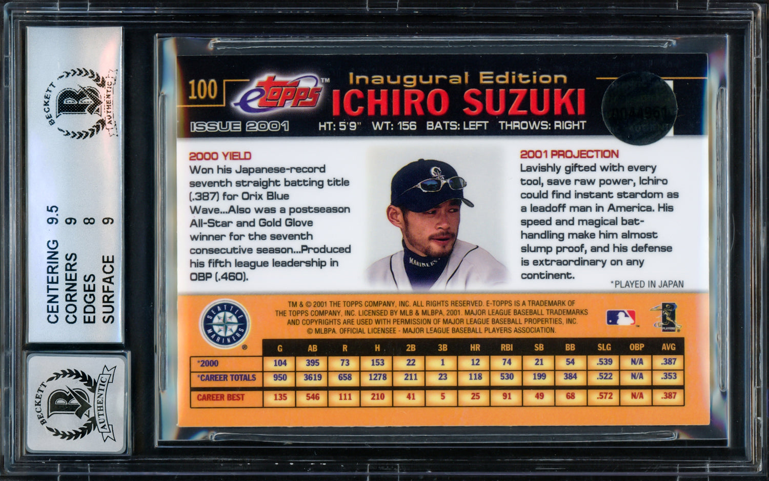 Ichiro Suzuki Autographed 2001 eTopps Rookie Card #100 Seattle Mariners BGS 8.5 Auto Grade Gem Mint 10 Beckett BAS Stock #216434