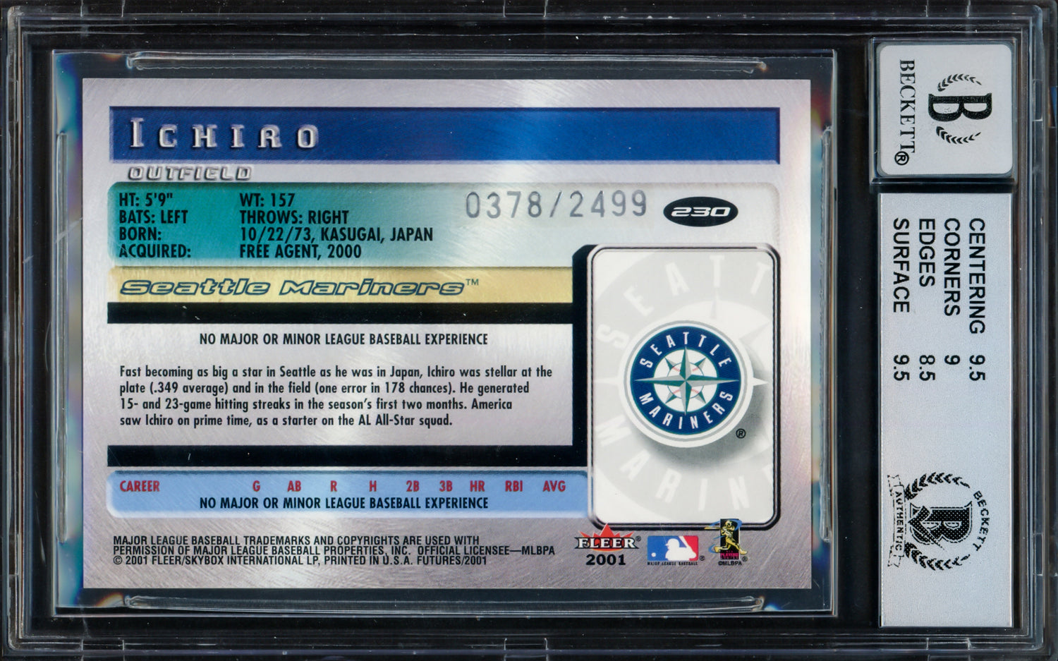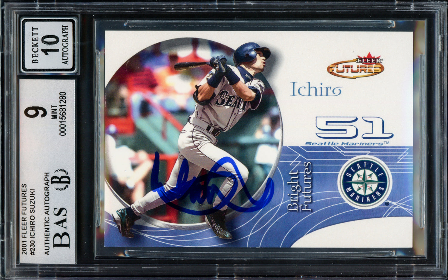 Ichiro Suzuki Autographed 2001 Fleer Futures Rookie Card #230 Seattle Mariners BGS 9 Auto Grade Gem Mint 10 #378/2499 Beckett BAS #15681280