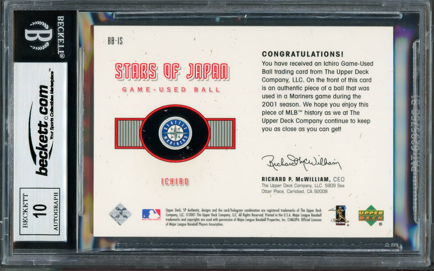 Ichiro Suzuki Autographed 2001 SP Authentic Stars of Japan Game Used Ball Rookie Card #BB-IS Seattle Mariners Auto Grade Gem Mint 10 Beckett BAS #14129086