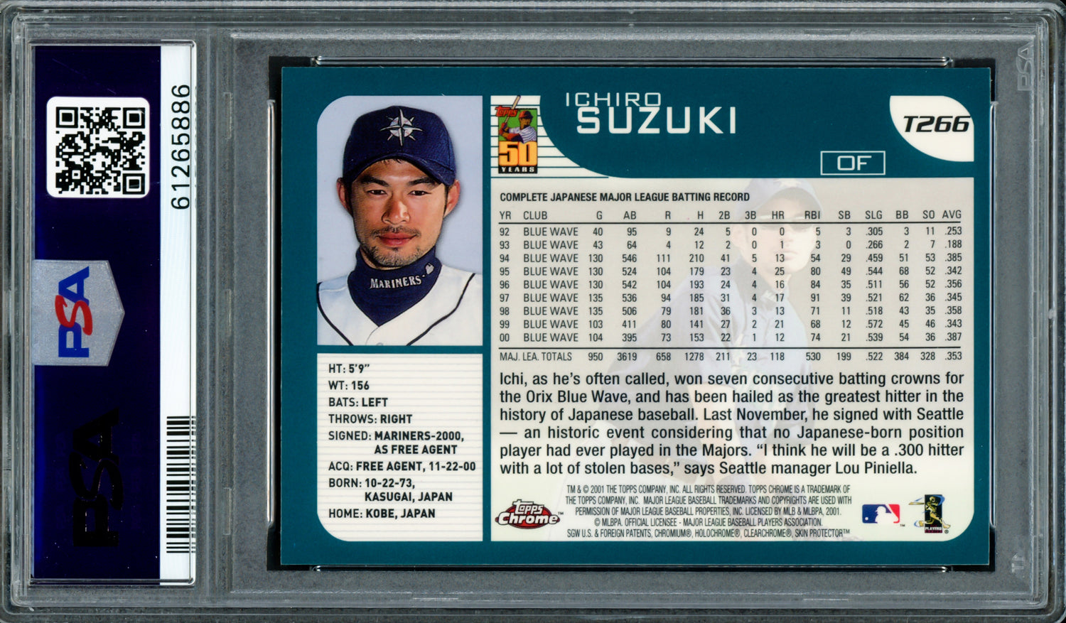- 2001 Topps Chrome Traded Rookie Card #T266 – marks Ichiro’s MLB debut year with the Seattle Mariners