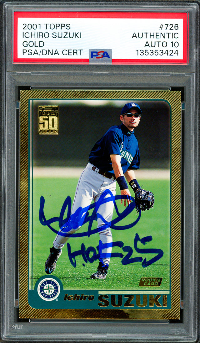 Celebrate the legendary career of one of baseball’s most iconic international stars with this 2001 Topps Gold Rookie Card #726 hand-signed by Ichiro Suzuki. This rare collectible not only captures Ichiro’s historic MLB debut season but also features a pristine Gem Mint 10 autograph, graded by PSA/DNA, with the exclusive "HOF 25" inscription—commemorating Ichiro’s future Hall of Fame induction class. Encapsulated in PSA/DNA’s tamper-proof holder, this card is a must-have for serious collectors and fans of the Seattle Mariners legend.