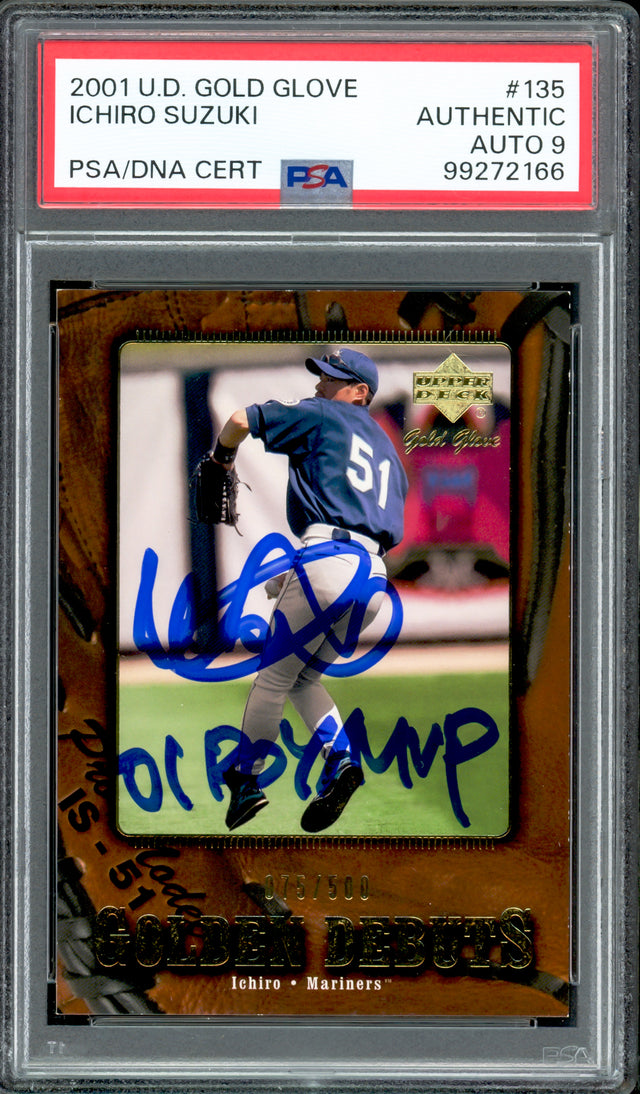 Ichiro Suzuki Autographed 2001 Upper Deck Gold Glove Rookie Card #135 Seattle Mariners Auto Grade Mint 9 "01 ROY/MVP" #75/500 PSA/DNA #99272166