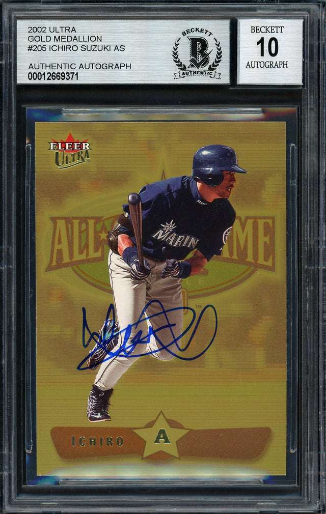 Ichiro Suzuki Autographed 2002 Fleer Ultra Gold Medallion Card #205 Seattle Mariners Auto Grade 10 Beckett BAS #12669371