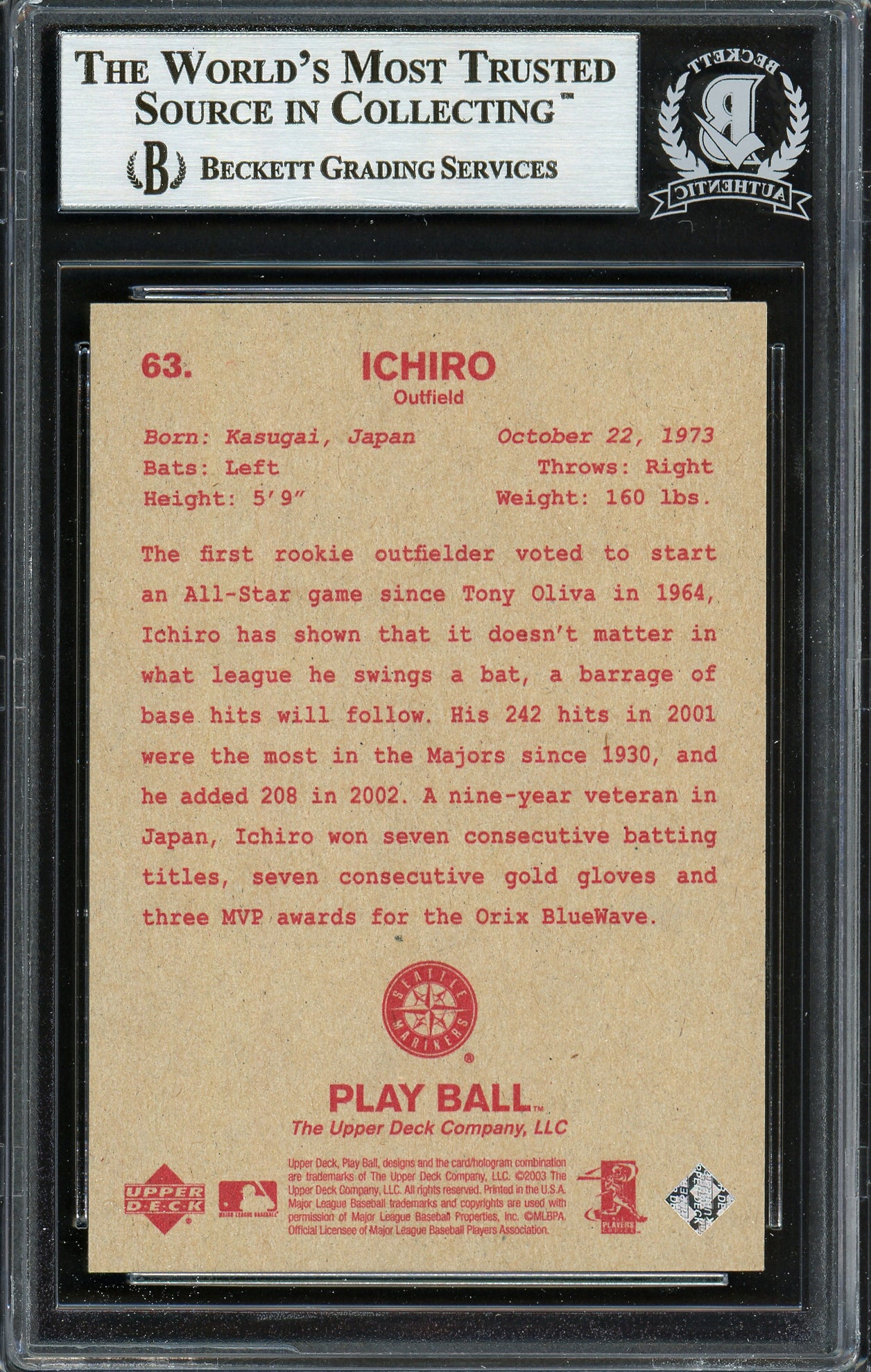 This 2003 Upper Deck Play Ball Card #63, hand-signed by legendary hitter Ichiro Suzuki, is a must-have for serious collectors and baseball fans. Known for his precision at the plate and record-breaking MLB career, Ichiro's autograph adds immense value to this sought-after card. Authenticated by Beckett Authentication Services (BAS), this piece of memorabilia is encapsulated in their tamper-proof holder, ensuring its authenticity and long-term preservation.