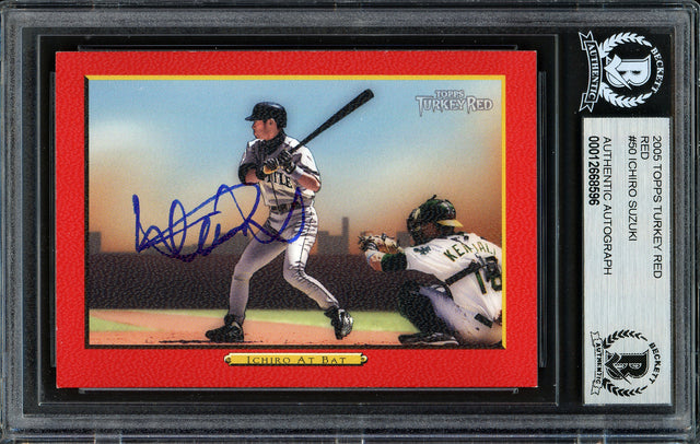 Own a piece of baseball history with this 2005 Topps Turkey Red Card #50, hand-signed by Ichiro Suzuki—one of the most iconic hitters in MLB history. This rare collectible has been certified authentic by Beckett Authentication Services (BAS) and comes securely encapsulated in their tamper-proof holder, ensuring its long-term preservation.