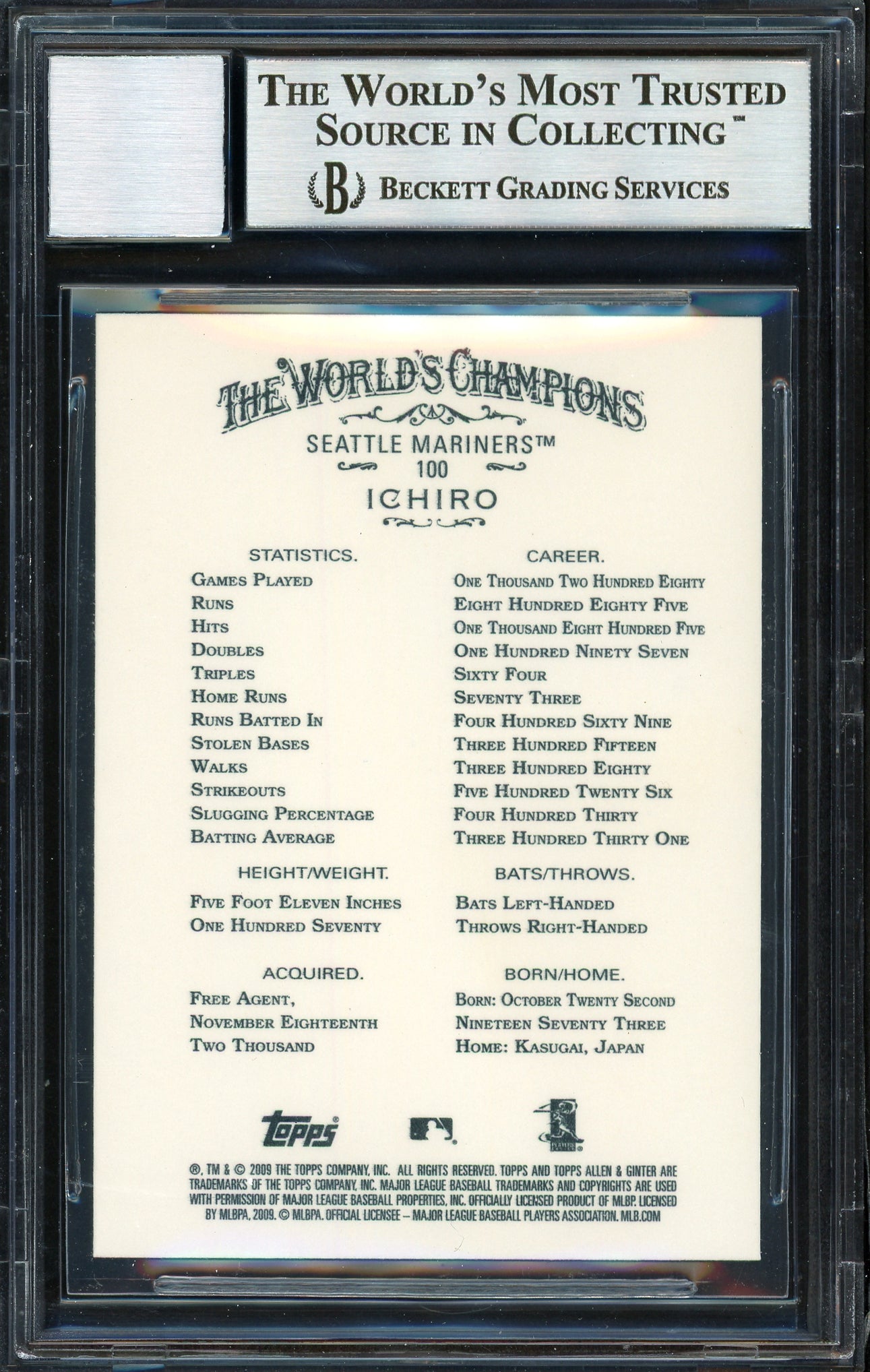 Ichiro Suzuki Autographed 2009 Topps Allen & Ginter Card #100 Seattle Mariners Auto Grade 10 Beckett BAS Stock #189869 is backordered and will ship as soon as it is back in stock.
