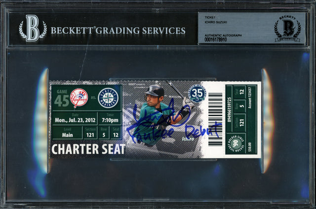 Ichiro Suzuki Autographed 2012 Ticket New York Yankees "Yankee Debut" Beckett BAS #16178910 is backordered and will ship as soon as it is back in stock.