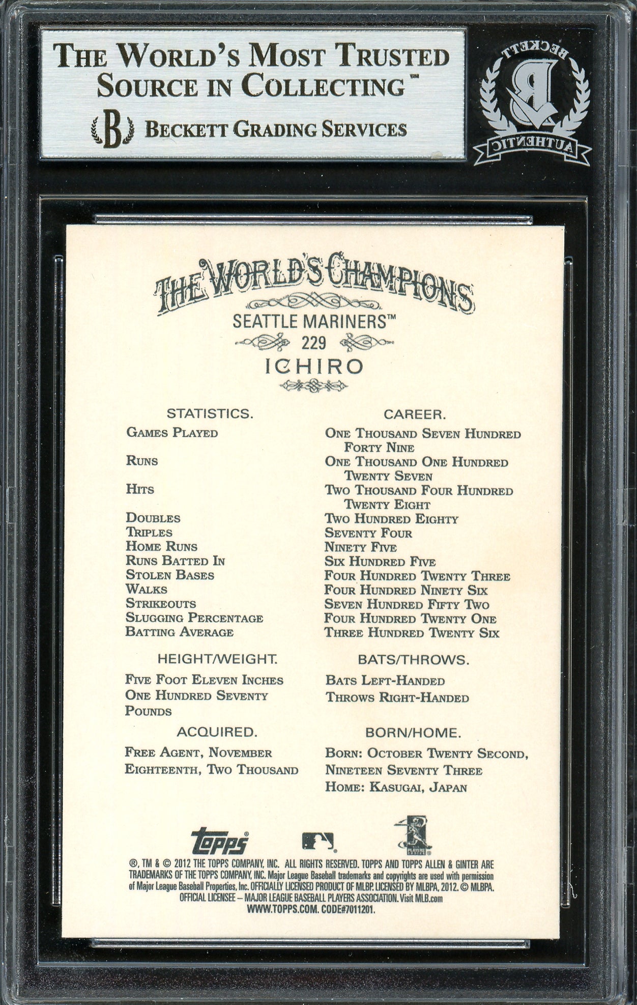 - Official 2012 Topps Allen & Ginter Card #229 featuring Ichiro Suzuki