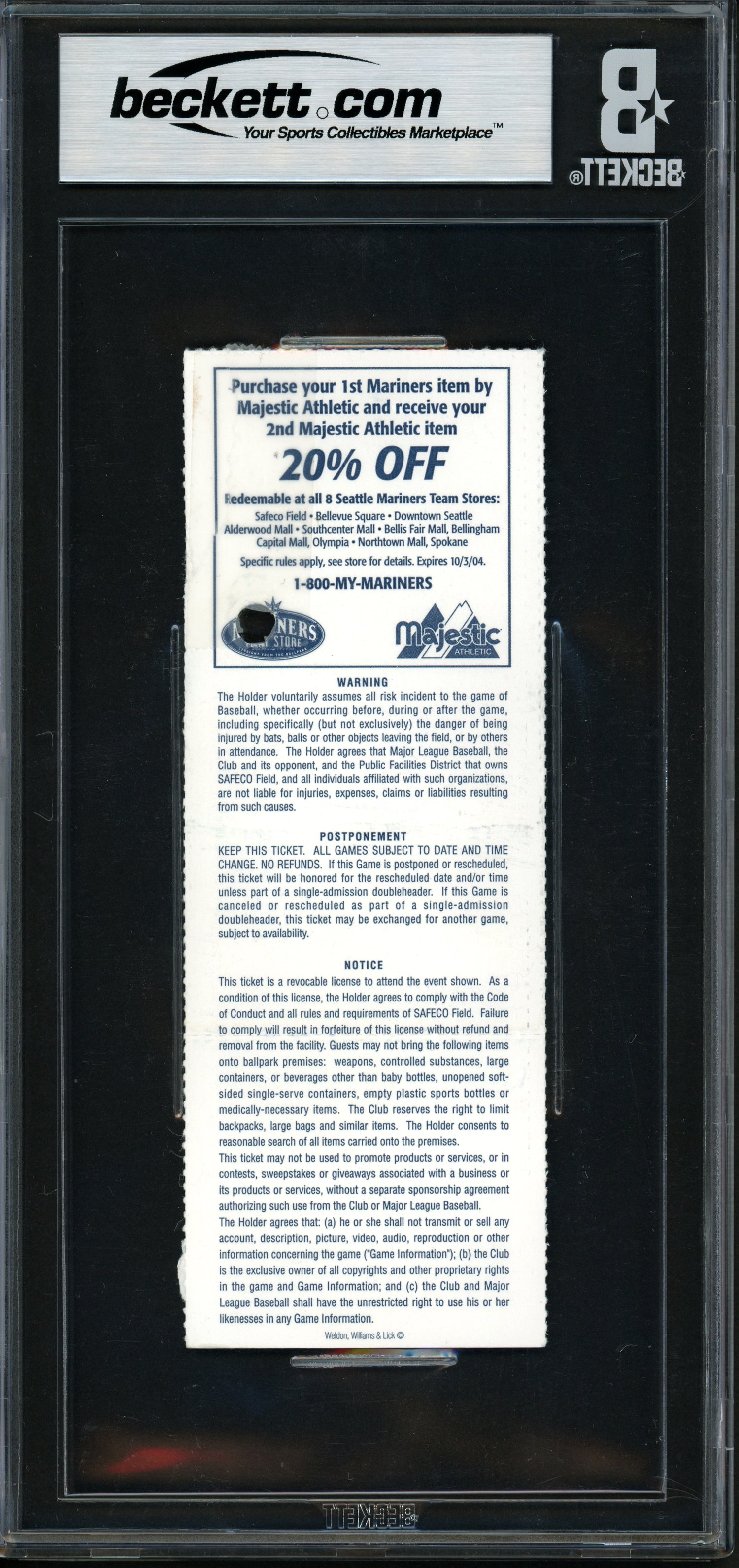 This Oct. 3, 2004, ticket—approximately 2"x6"—has been hand-signed by Ichiro Suzuki and is a must-have for baseball collectors. This historic game marked the moment Ichiro set the MLB all-time single-season hit record with his 262nd hit. His signature has been professionally graded Gem Mint 10 by Beckett BAS, ensuring pristine quality and authenticity.