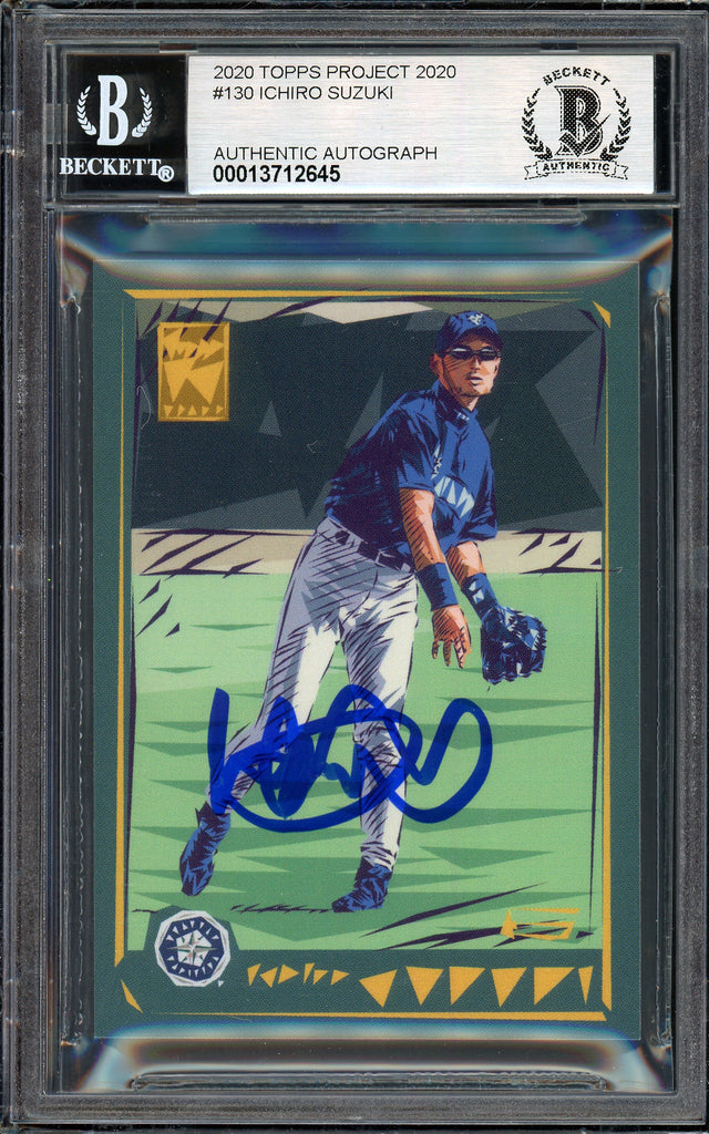Own a rare piece of baseball history with this Topps Project 2020 Naturel Card #130, hand-signed by legendary outfielder Ichiro Suzuki. This exclusive collectible has been professionally authenticated and encapsulated by Beckett Authentication Services (BAS), with Ichiro's signature earning a prestigious Gem Mint 10 grade, ensuring its exceptional quality.