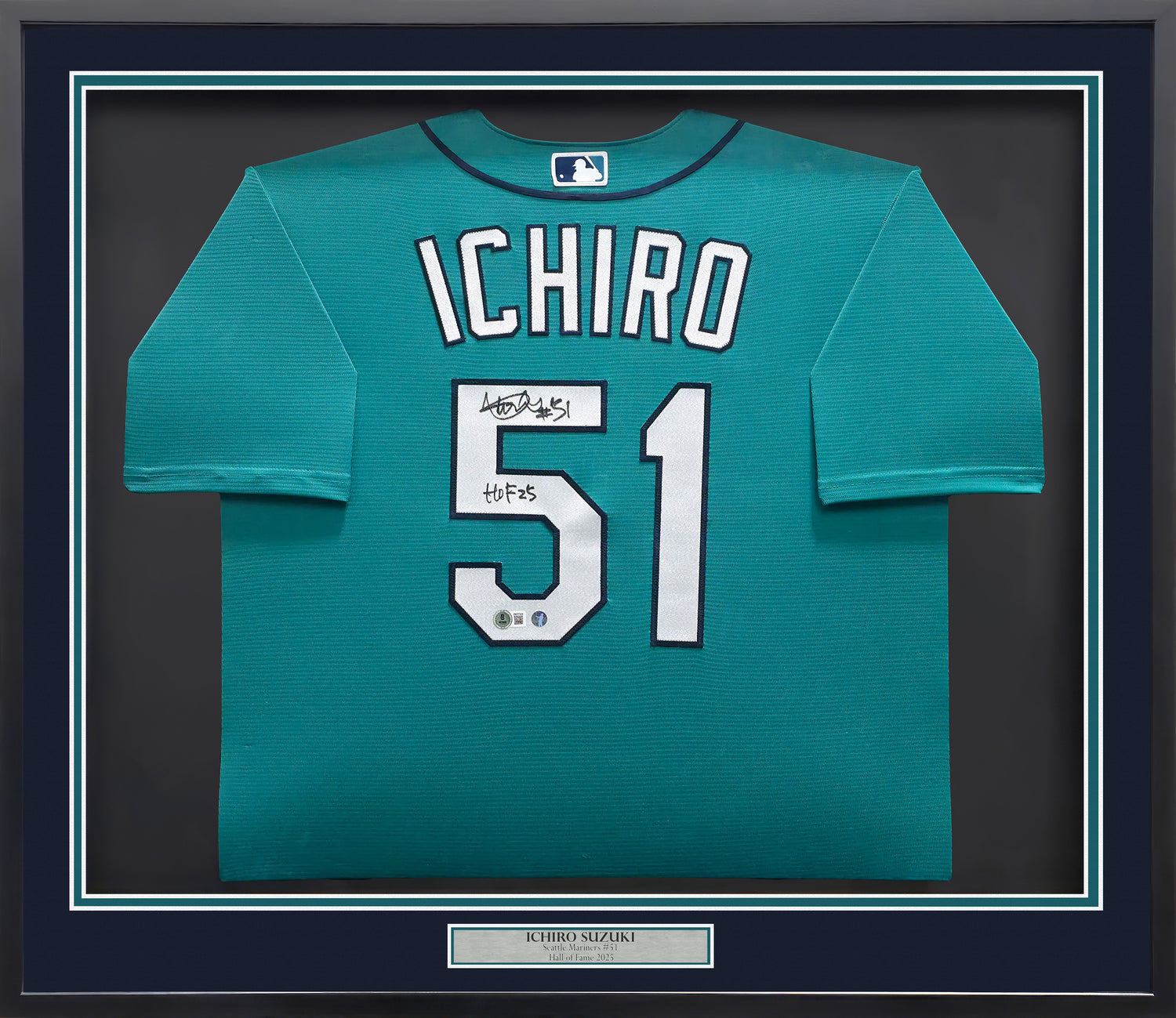 Celebrate the legendary career of one of baseball’s most iconic players with this framed Teal Nike Seattle Mariners jersey hand-signed by Ichiro Suzuki, featuring his rare "HOF 25" inscription commemorating his Hall of Fame induction year. A must-have for serious collectors and Mariners fans, this stunning display piece captures the spirit of Ichiro’s MLB legacy and global impact on the game.