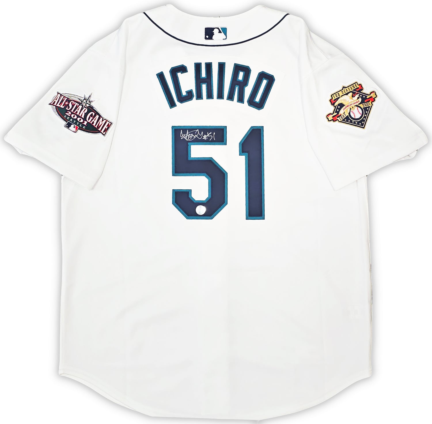 Own a piece of baseball history with this White Authentic Mitchell & Ness Seattle Mariners 2001 All-Star Patch Jersey, hand-signed by Ichiro Suzuki. This collectible jersey celebrates Ichiro’s unforgettable 2001 rookie season, where he took the league by storm and earned both AL Rookie of the Year and MVP honors.