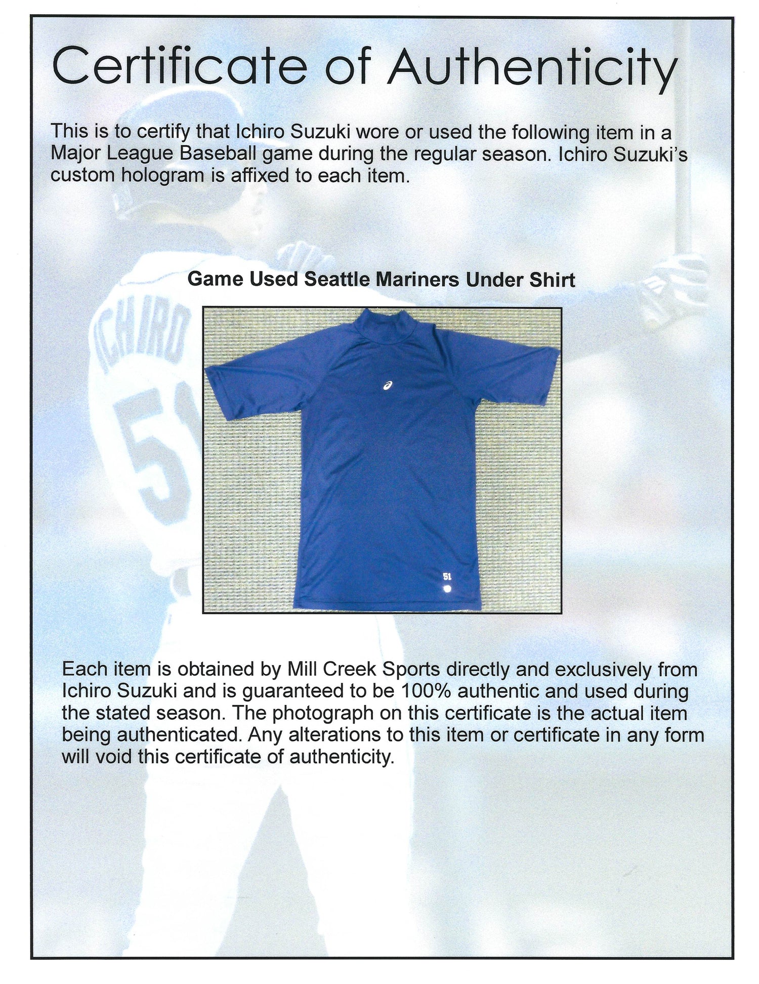 Own a rare piece of baseball history with this game-used Asics Under Shirt from legendary outfielder Ichiro Suzuki. This exclusive collectible was personally used by Ichiro and comes directly from him, making it a must-have for serious collectors and Seattle Mariners fans.