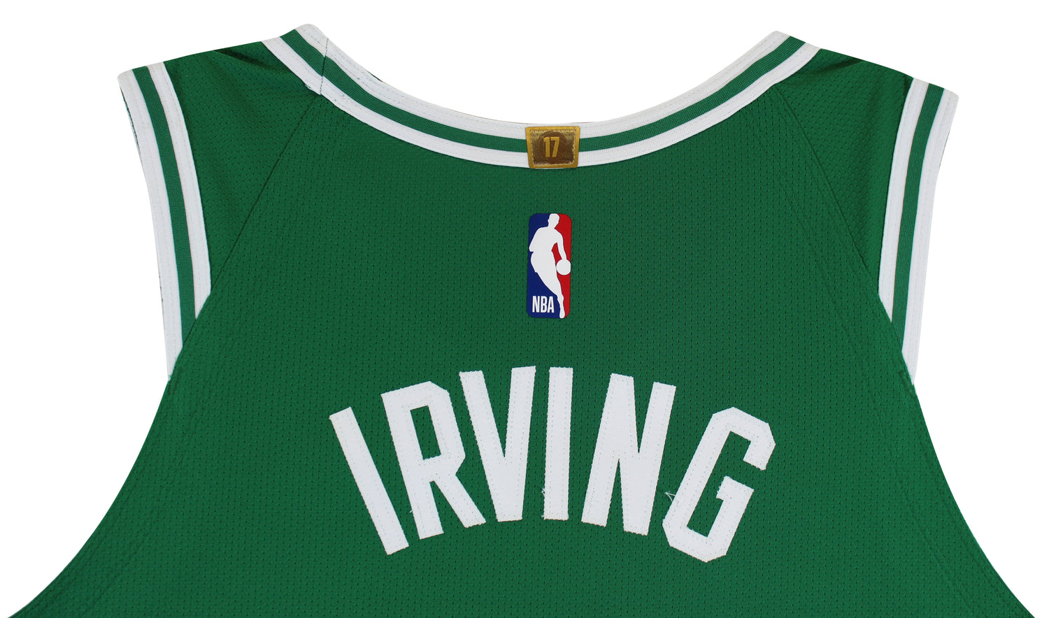 - NBA logo patch, gold Larry O’Brien trophy patch with “17”, and white/green/white striped trim.