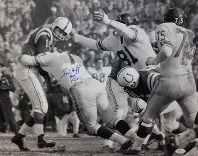 Own a piece of football history with this Sam Huff Autographed 16x20 New York Giants vs. Colts Photo, authenticated by JSA Witness Authentication. Sam Huff, a legendary linebacker and Hall of Famer, was a cornerstone of the Giants' defense during the 1950s and '60s, making this signed photo a must-have for collectors and fans alike.