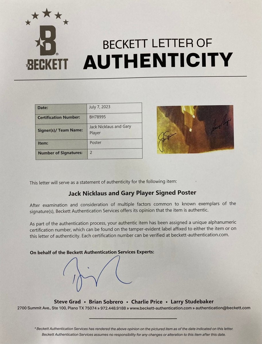 Whether you're an avid golf memorabilia collector or searching for the ultimate gift for a fan, this signed Jack Nicklaus & Gary Player poster is an investment in sports history. Don't miss the chance to own this exclusive piece honoring two of the sport’s greatest legends!