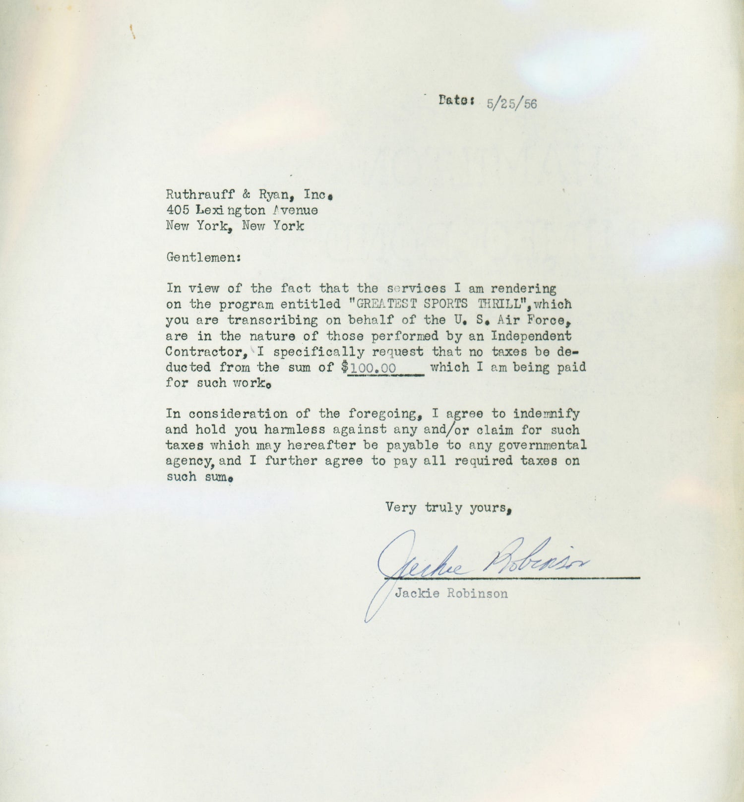 - Authentic 1956 "Greatest Sports Thrill" Contract, hand signed by legendary Hall of Famer Jackie Robinson
