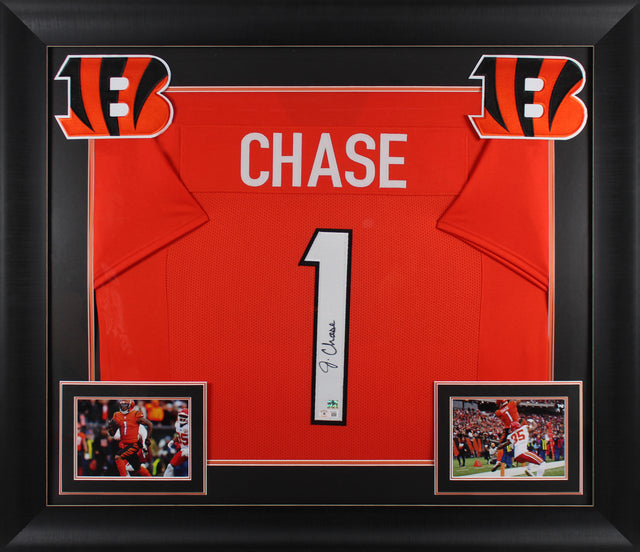 Own a piece of Cincinnati Bengals history with this Autographed Orange Pro Style Framed Jersey, personally signed by star wide receiver Ja'Marr Chase. A must-have for serious collectors and passionate fans, this jersey is a standout addition to any memorabilia collection. Each autograph is 100% Authentic, verified by Beckett Authentication Services (BAS) or James Spence Authentication (JSA), ensuring its legitimacy.