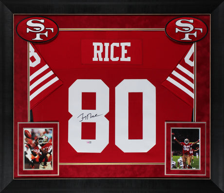 49ers Jerry Rice Signed Red Mitchell & Ness Framed Jersey w/ Dropshadow Fanatics
