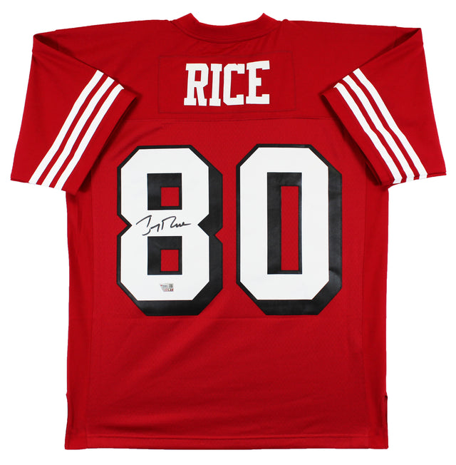 Own a piece of football history with this Jerry Rice Autographed Red Mitchell & Ness Jersey, celebrating one of the greatest wide receivers of all time. A legendary figure in San Francisco 49ers history, Rice's incredible career and record-breaking performances make this signed jersey a prized collectible for any fan or memorabilia enthusiast. Featuring the striking red dropshadow design, this jersey is both a nostalgic tribute and a standout addition to any collection.