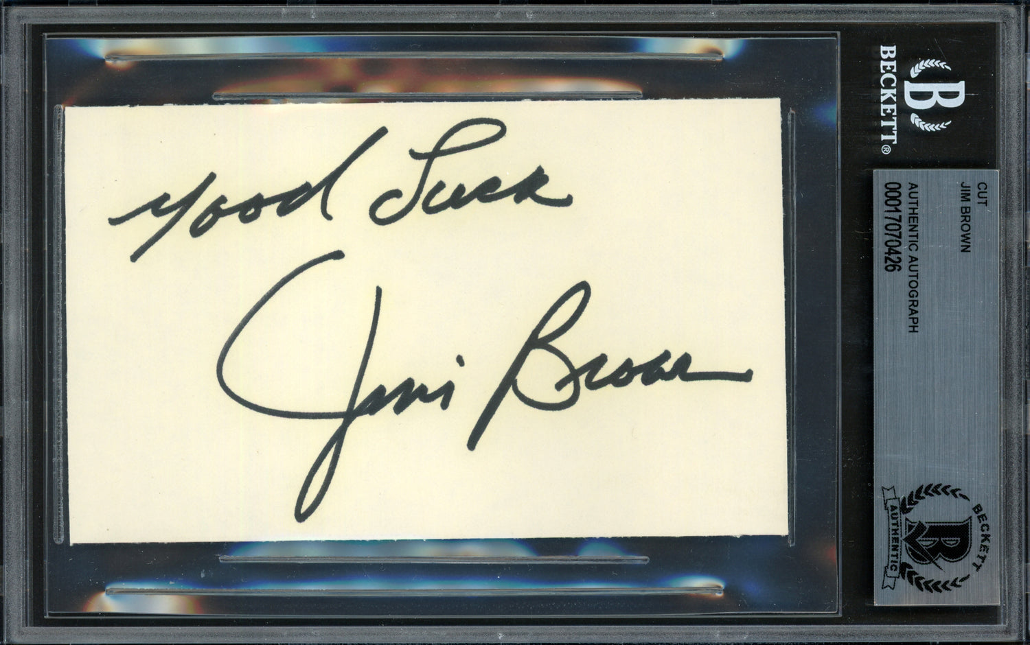Jim Brown Autographed 3x5 Cut Signature Cleveland Browns "Good Luck" Beckett BAS #17070426