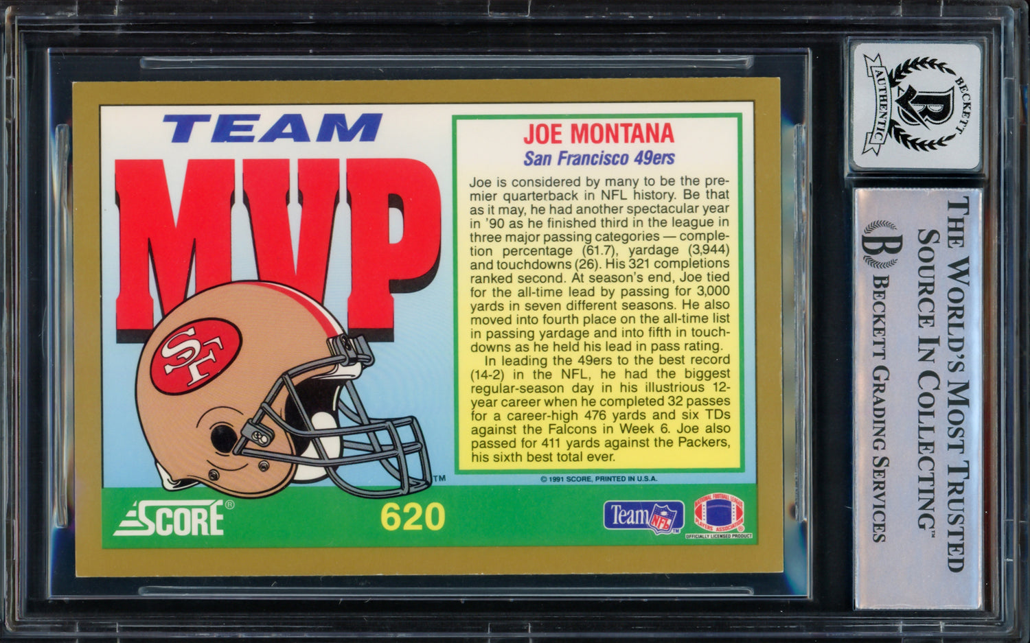 Joe Montana Autographed 1991 Score Card #620 San Francisco 49ers Auto Grade Gem Mint 10 Beckett BAS Stock #228997