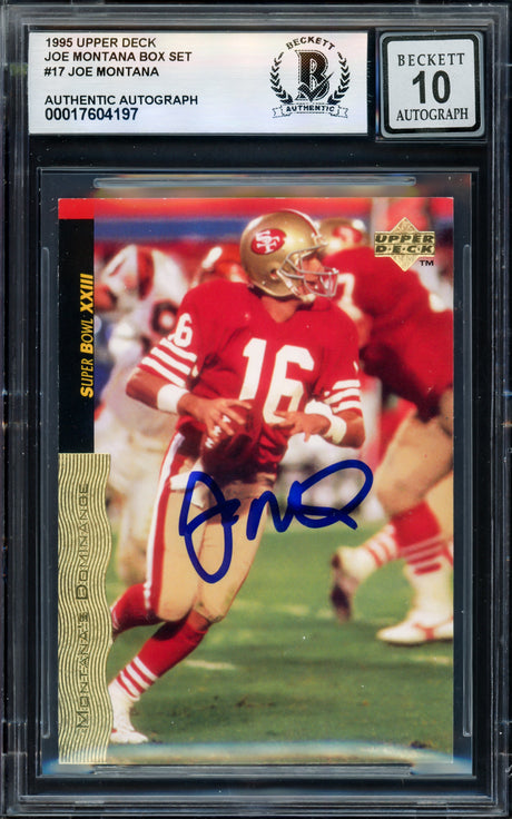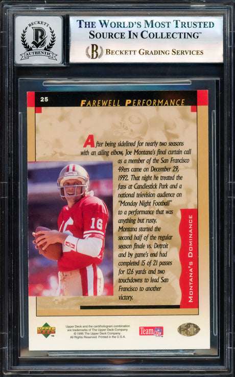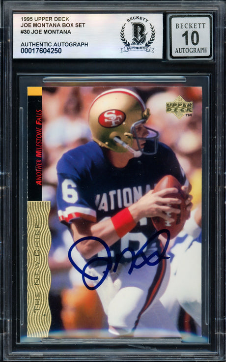 Very low stock (1 unit)$109Unit price /Unavailable Joe Montana Autographed 1995 Upper Deck Card #20 San Francisco 49ers Beckett BAS #17606256