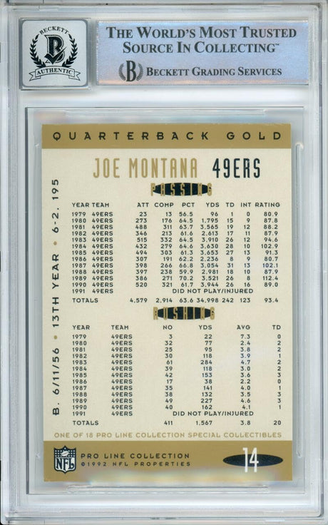 1992 Pro Line Portraits QB Gold #14 Joe Montana San Francisco 49ers BGS Auto 10