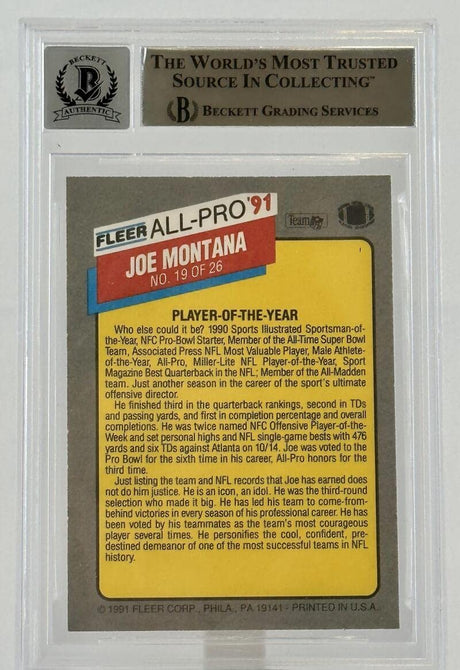 1991 Fleer All-Pros #19 Joe Montana Auto San Francisco 49ers BGS Autograph 10