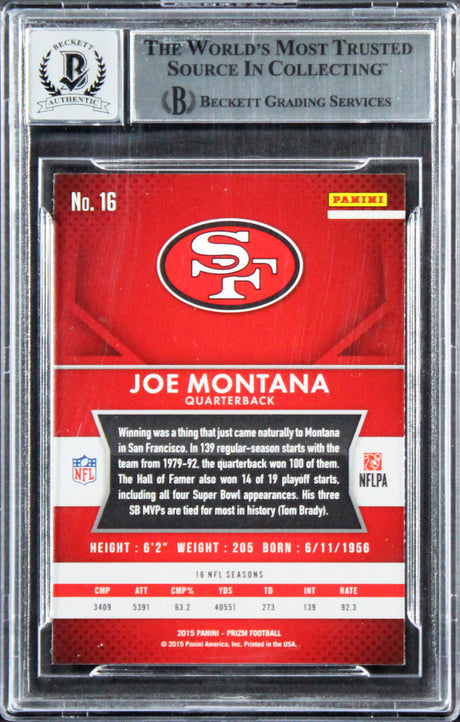 49ers Joe Montana Signed 2015 Panini Prizm #16 Card Auto 10! BAS Slabbed
