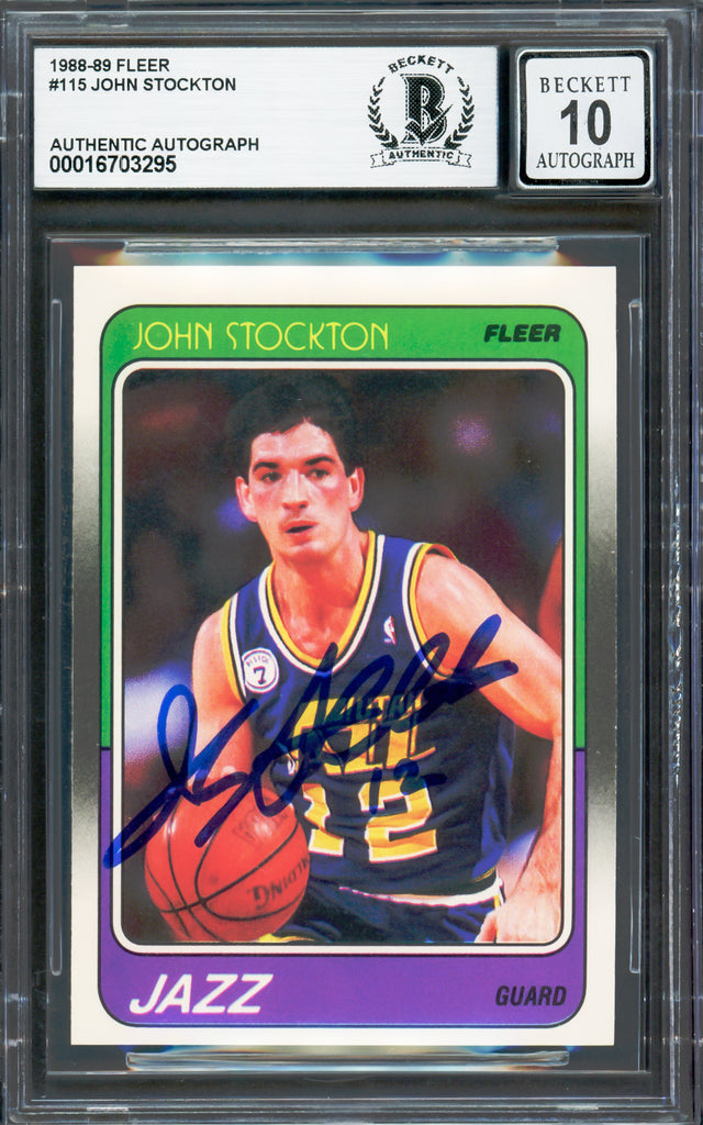 John Stockton Autographed 1988-89 Fleer Rookie Card #115 Utah Jazz Auto Grade Gem Mint 10 Beckett BAS #16703295