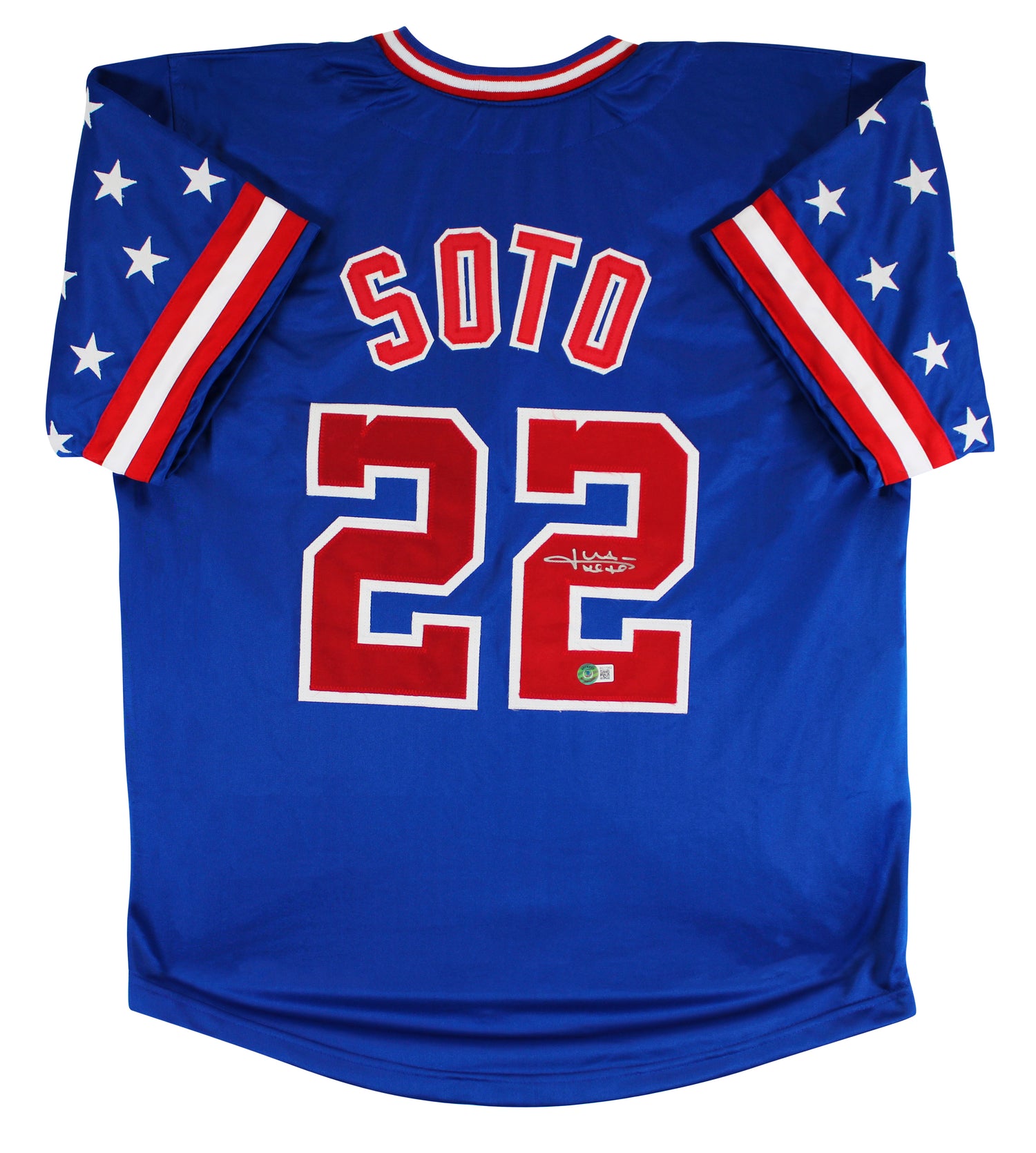 Own a piece of baseball history with this Autographed Blue USA Pro Style Jersey personally signed by Juan Soto of the New York Mets. Juan Soto, one of the most dynamic hitters in Major League Baseball, has earned a reputation for his clutch performances and elite plate discipline since his breakout years with the Washington Nationals and now brings his star power to the New York Mets. This signed jersey not only celebrates a rising MLB superstar, but also provides an authentic collector's item perfect for any Mets fan or memorabilia enthusiast.