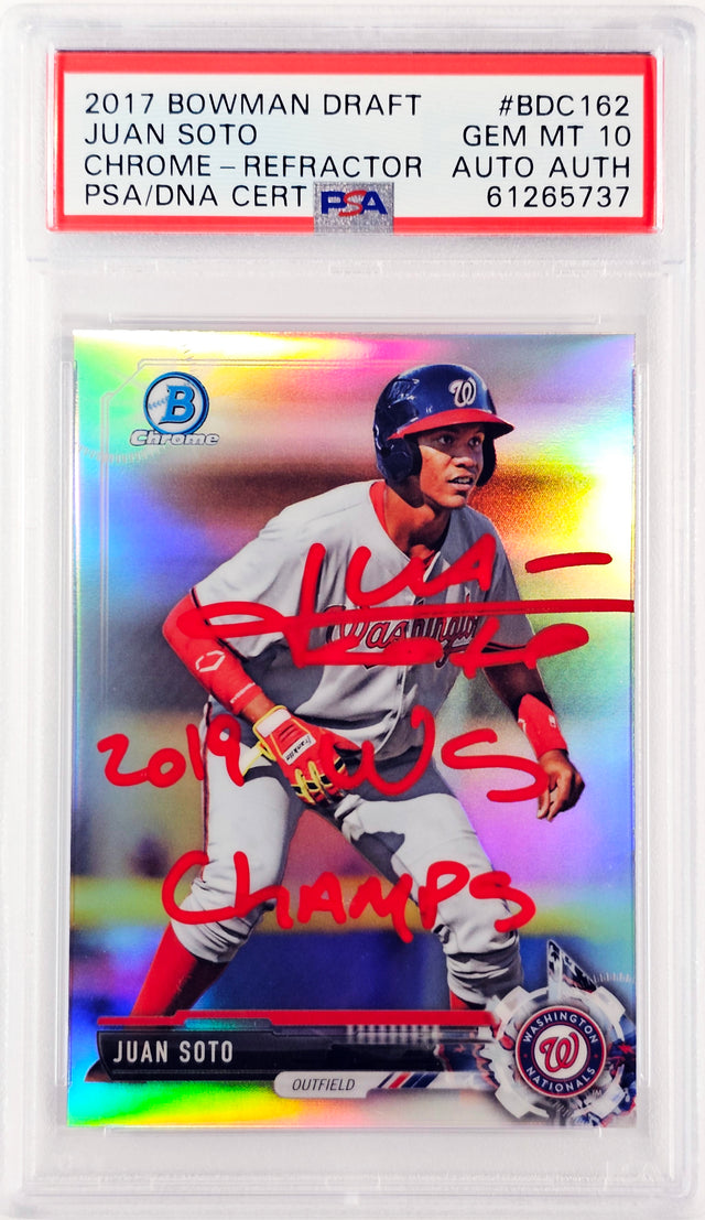 Own a stunning piece of baseball history with this 2017 Bowman Draft Chrome Refractor Rookie Card #BDC162 signed by Juan Soto. Celebrated for his breakout impact in the MLB and pivotal role in securing the 2019 World Series Championship for the Washington Nationals, Soto's rookie memorabilia is rapidly gaining value among collectors. This autographed card is graded Gem Mint 10 by PSA, capturing peak condition and unparalleled eye appeal, making it a must-have for serious hobbyists and Soto fans alike. It also includes the compelling inscription "2019 WS Champs", commemorating a historic championship moment in Nationals history. Authenticated and encapsulated by PSA/DNA in their tamper-proof holder, this card offers not only collector prestige but long-term security and investment confidence.