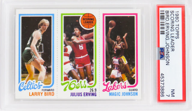 Larry Bird, Magic Johnson & Julius Erving 1980 Topps Scoring Leader RC Card (PSA 7 NM)(PWCC Top 30% Eye Appeal)(D)
