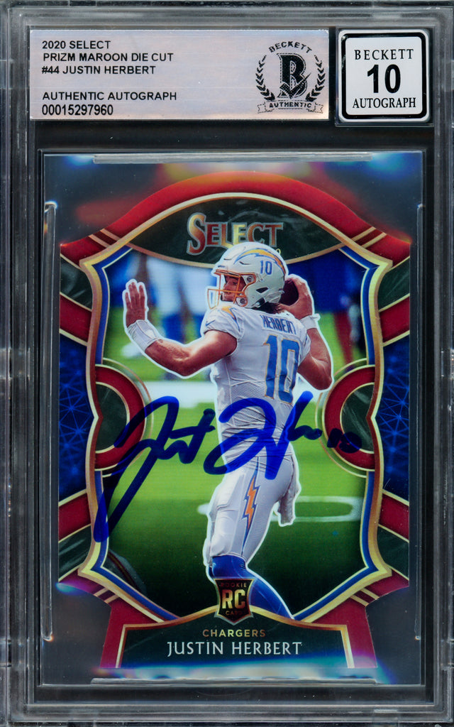 Justin Herbert Autographed 2020 Select Prizm Maroon Die Cut Rookie Card #44 Los Angeles Chargers Auto Grade Gem Mint 10 Beckett BAS #15297960
