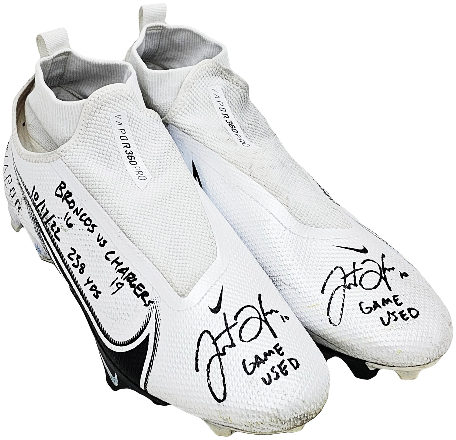 Own a rare piece of NFL history with this Pair of Game-Used White & Black Nike Vapor 360 Pro Cleats, personally hand-signed by Justin Herbert. These cleats were worn during the Los Angeles Chargers' 19-16 victory over the Denver Broncos on October 17, 2022, a game where Herbert recorded 238 passing yards. This is a must-have for serious collectors and Chargers fans!