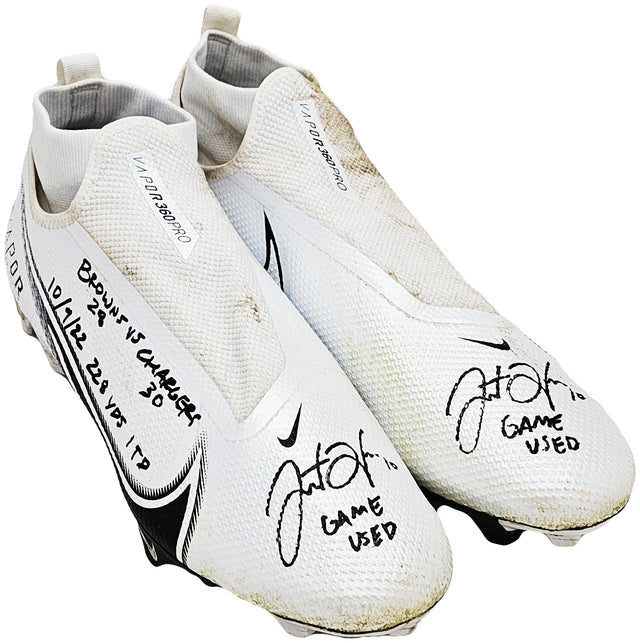 Own a piece of NFL history with this Pair of Game-Used White & Black Nike Vapor 360 Pro Cleats, personally hand-signed by Justin Herbert. These cleats were worn during the Los Angeles Chargers' thrilling 30-28 victory over the Cleveland Browns on October 9, 2022, a game where Herbert recorded 228 passing yards and 1 touchdown.